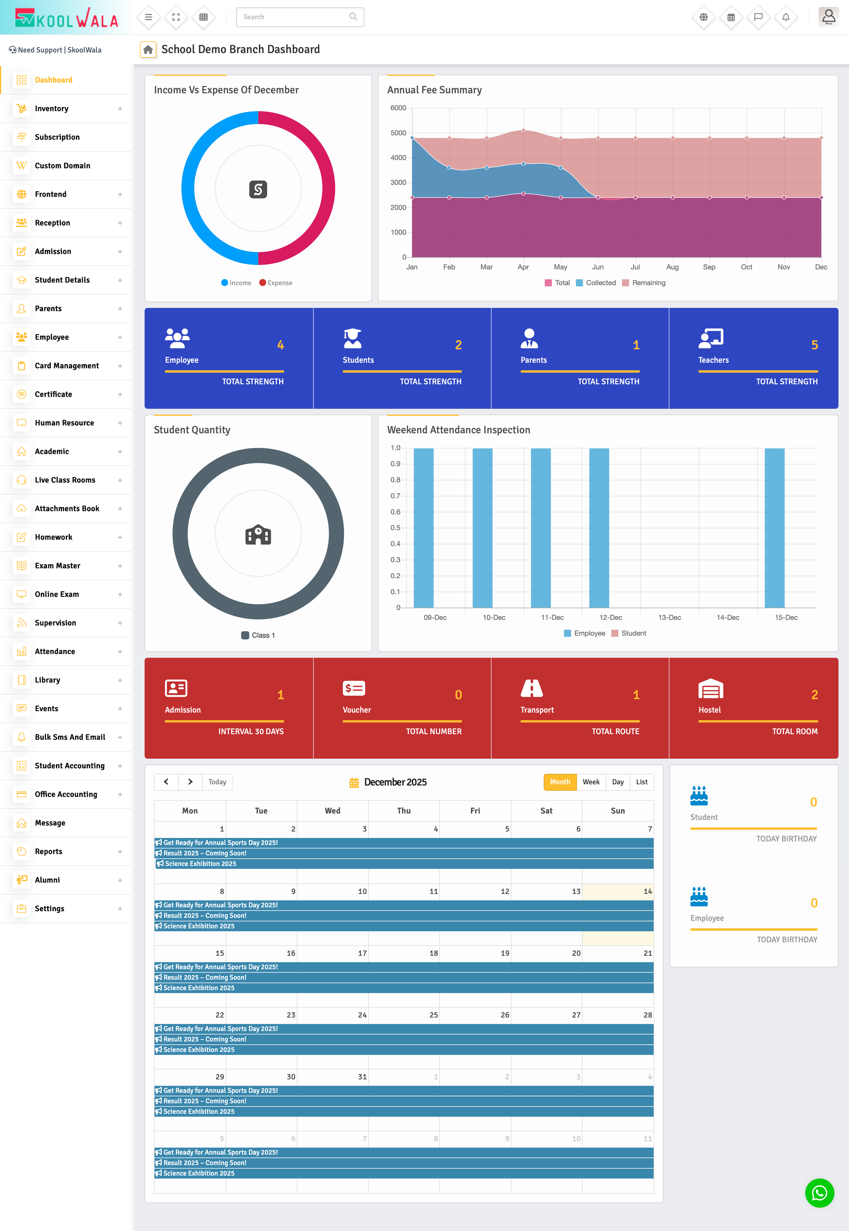 The Dashboard is the first screen you see after login. It gives you a quick summary of your school’s current status.